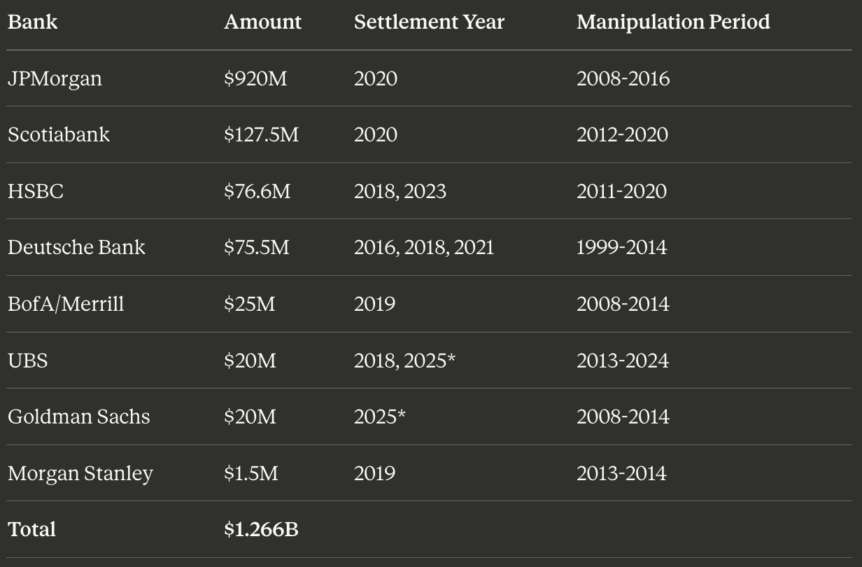 *UBS $5M (2025) and Goldman $20M (2025) represent final settlement approvals for manipulation that occurred years earlier (2015–2024 surveillance failures for UBS, 2008–2014 Pt/Pd manipulation for Goldman). These settlements are for PAST violations unrelated to the 2025 silver rally.