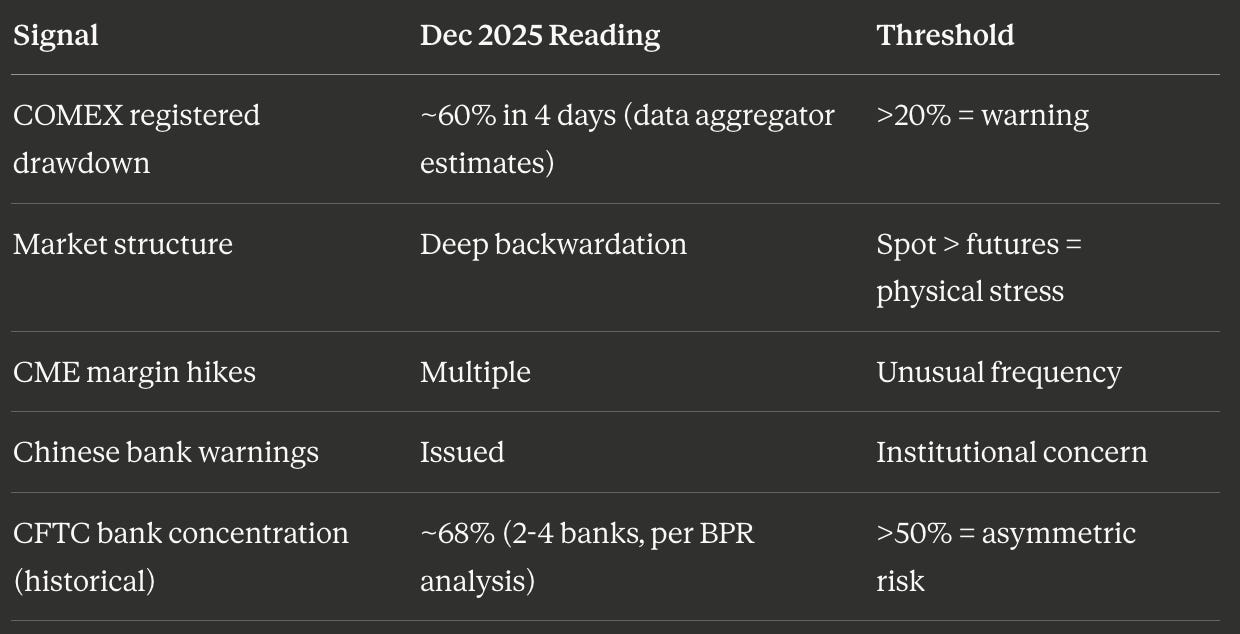COMEX registered silver inventory serves as leading indicator for physical stress. The December 2025 drawdown (60% in 4 days) preceded the peak by 2–3 weeks, providing an actionable signal window.