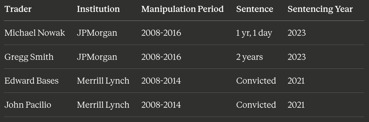 Criminal convictions: Two JPMorgan traders served federal prison time (sentenced 2023 for 2008–2016 spoofing)