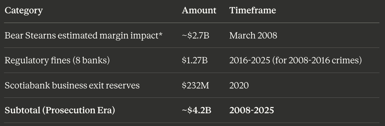 Regulatory fines: $1.27B across eight banks (settlements 2016–2025 for 2008–2016 crimes)