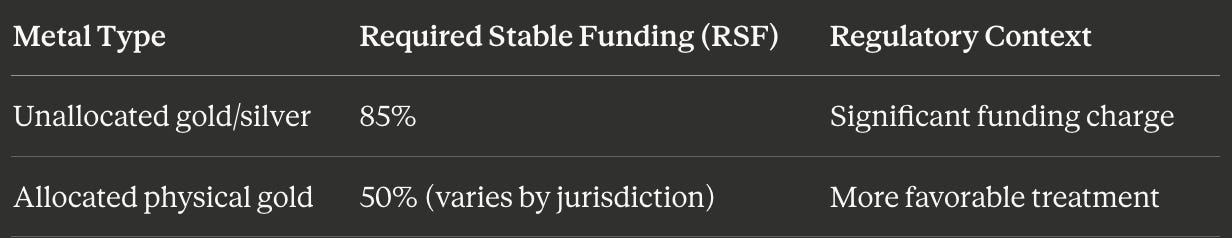 85% RSF charge on unallocated positions versus 0–50% on allocated gold creates regulatory arbitrage. Banks have structural incentive to minimize paper exposure.