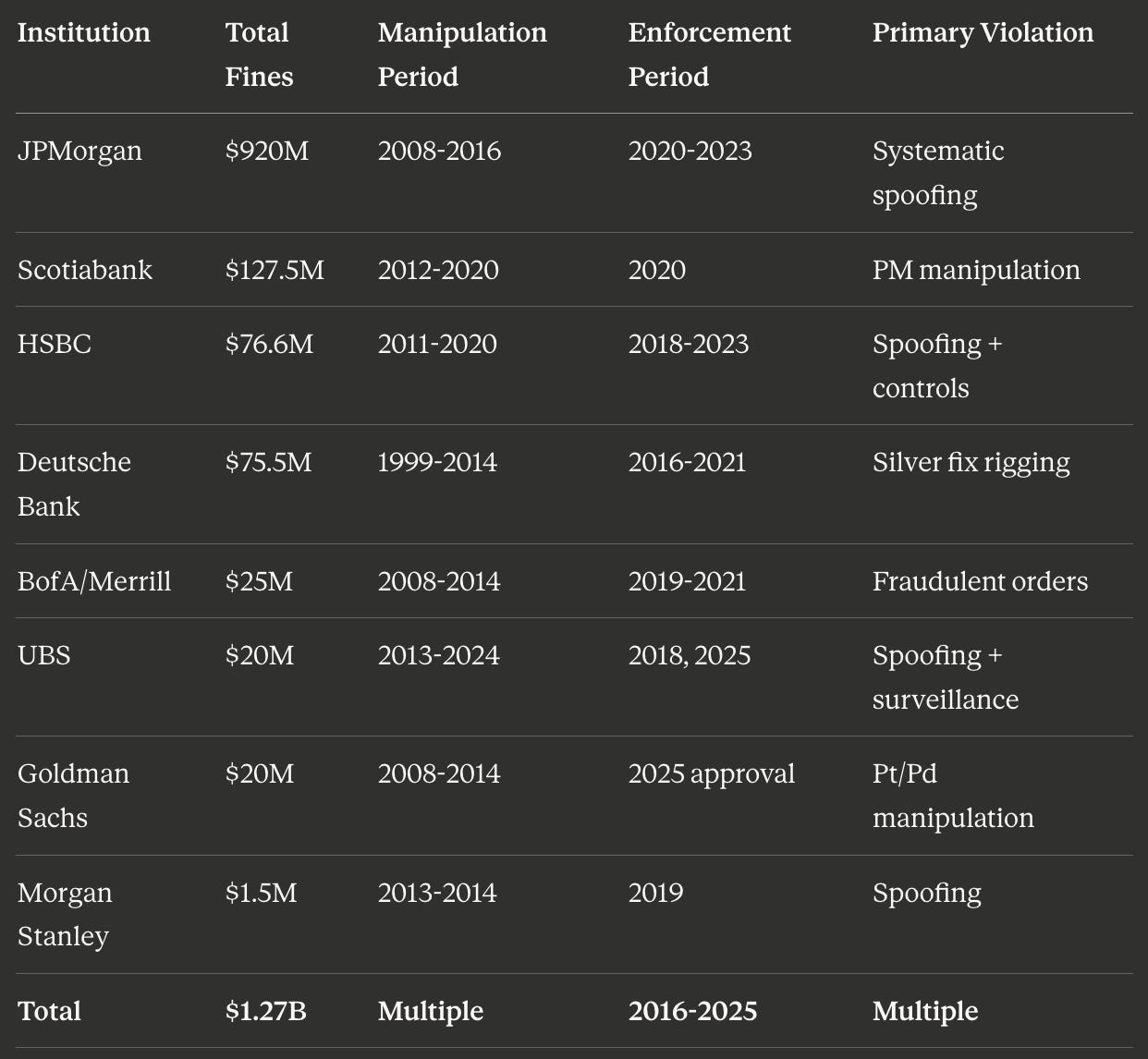 The Pattern: The 2025 rally vindicated the prosecutions. Banks manipulated silver for years (2008–2016), paid massive fines (2016–2025), and two traders went to prison (2023). Then when supply deficits became structural, remaining short positions faced convex losses in a market that had been artificially suppressed.
