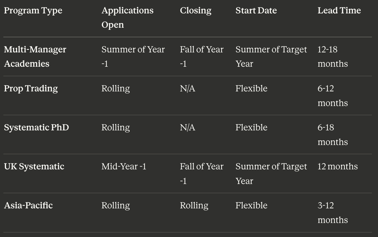 Important Caveat: Recruiting timelines vary by firm, role, and region. The above reflects Tier 1 multi-manager and prop trading programs. Many systematic funds, regional offices, and emerging managers recruit on rolling schedules throughout the year. Always verify current status on firm career pages.
