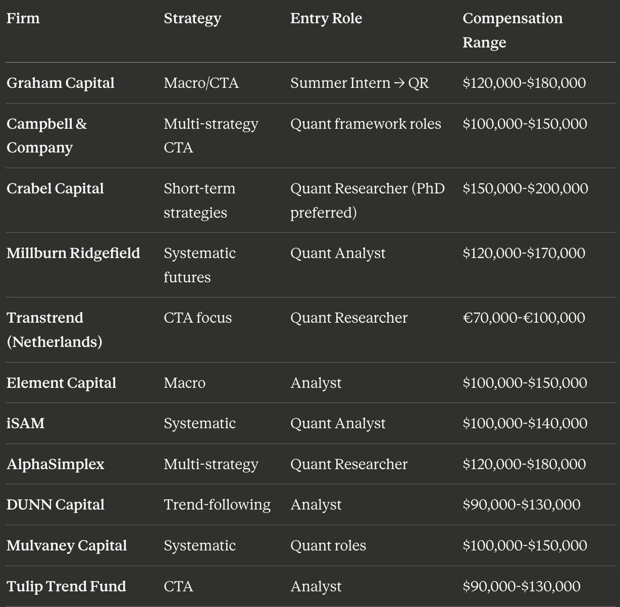 Key Insight: PhD quantitative researcher roles offer the fastest path to PM at systematic funds. No intermediate analyst steps required. Direct path from QR → Senior QR → Quant PM in 6–8 years.