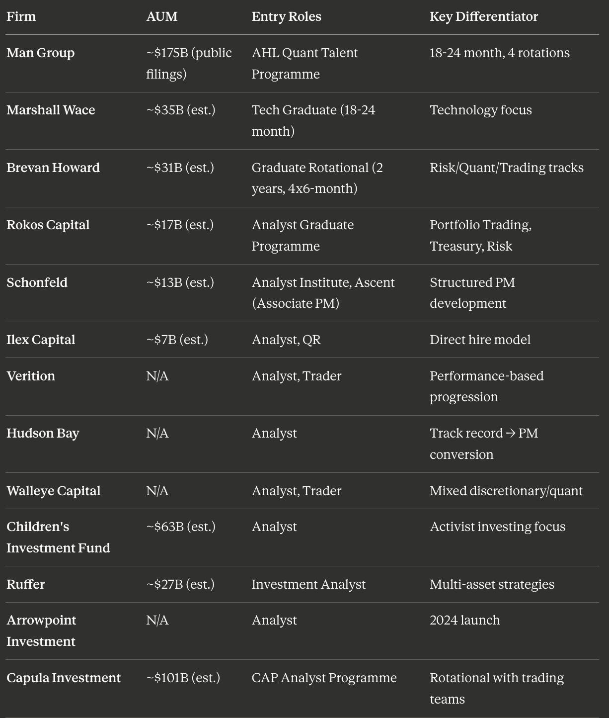 Data compiled and verified January 2026 against official sources, regulatory filings, and verified compensation databases. All compensation figures and program structures subject to change. AUM figures reflect Net Assets (investor capital) per latest available regulatory filings (December 2025-January 2026). Verify current openings directly with firms. This analysis is for informational purposes only and does not constitute career advice or employment recommendations.