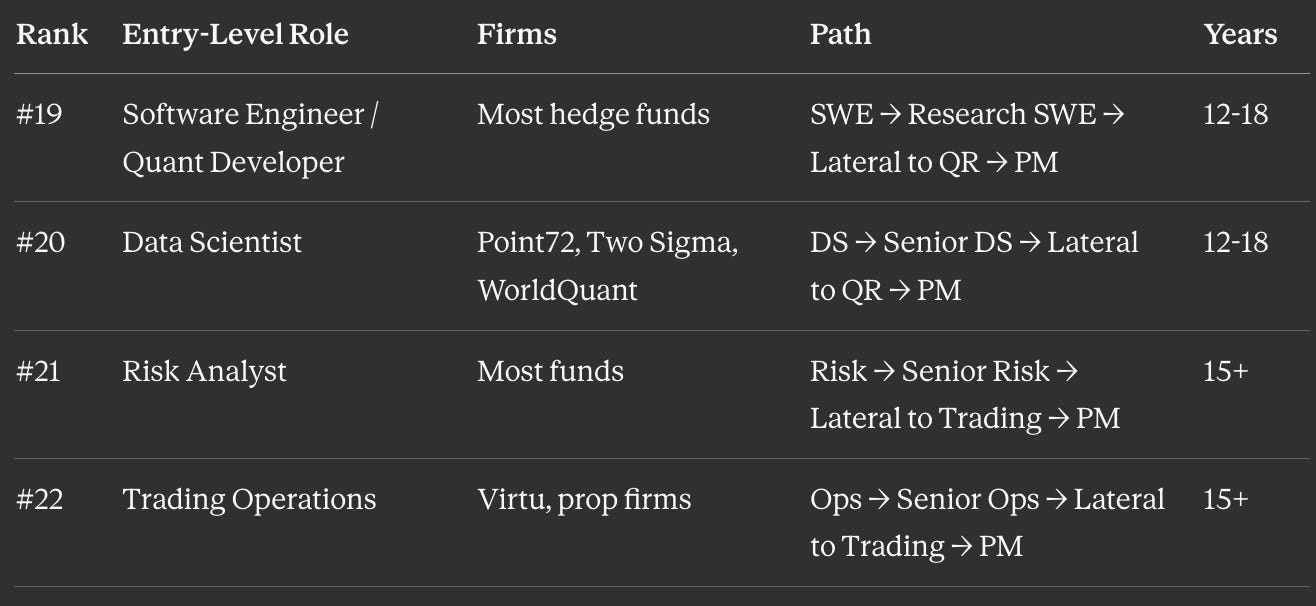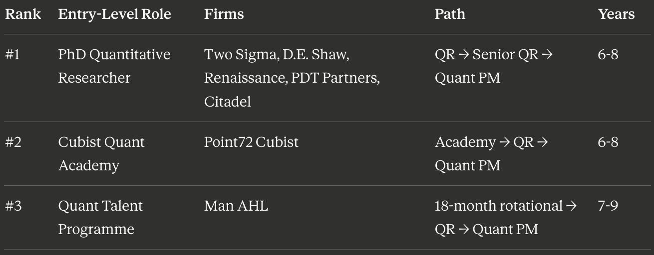 Path: QR → Senior QR → Quant PM (6–10 years)
