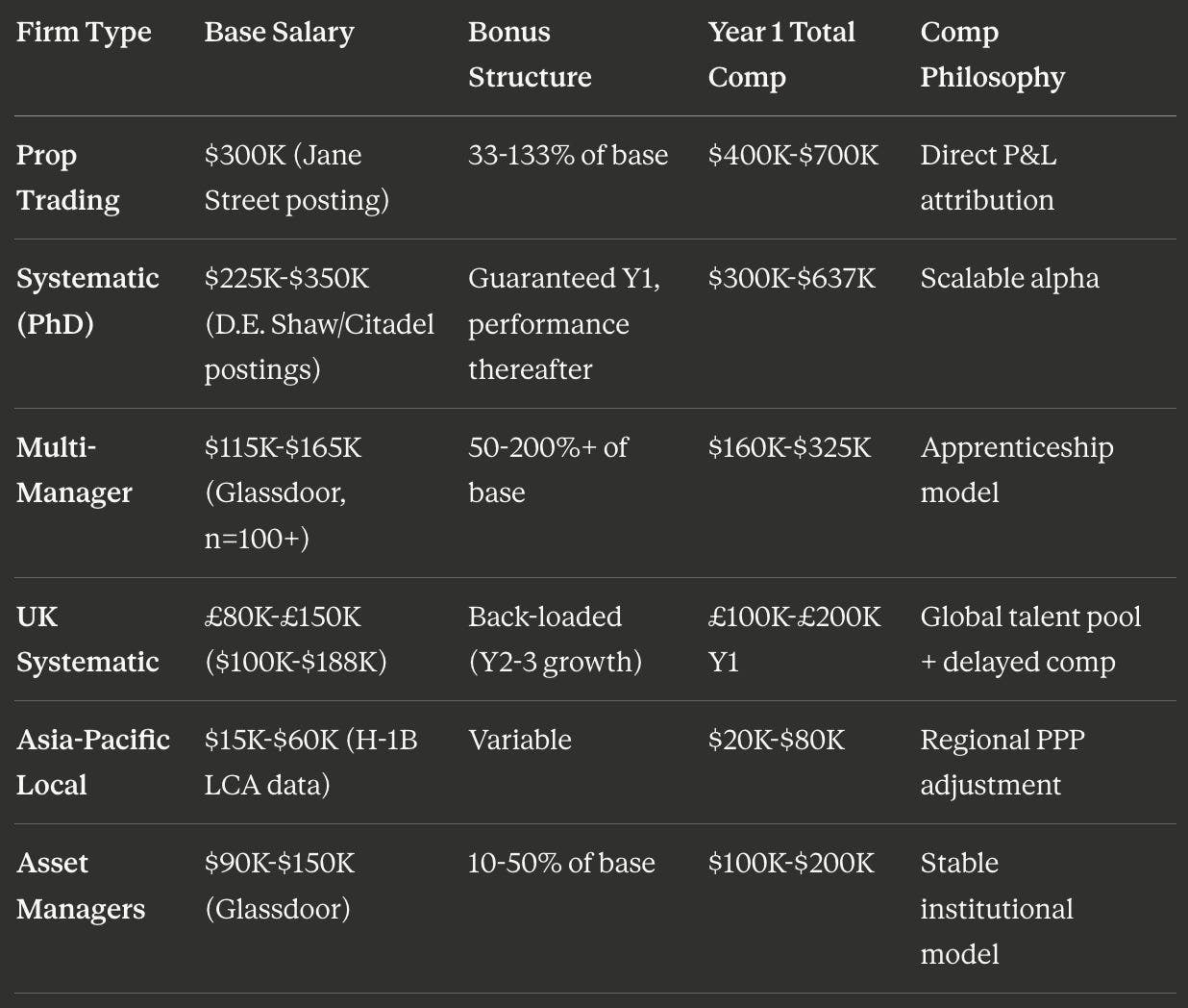 Compensation: Base salaries contractual; total comp (bonus + carry) varies 50–200%+ by performance. Year 1 figures represent estimates based on historical averages from verified databases. Individual outcomes vary significantly based on performance, desk assignment, and market conditions.